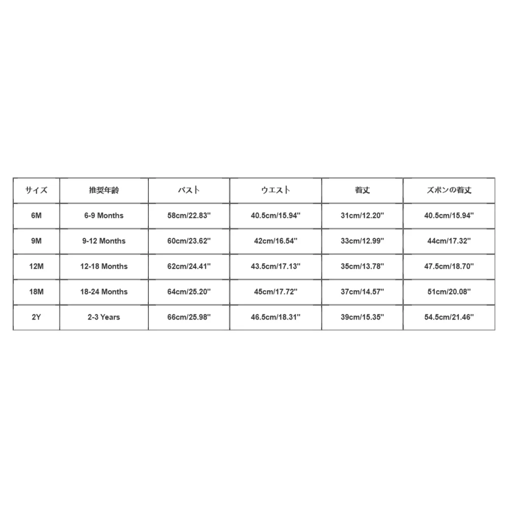 | Size:6M | Recommended age:6-9 Months | Bust:58cm/22.83” | Waist:40.5cm/15.94” | Length:31cm/12.20” | Bottoms Length:40.5cm/15.94” |