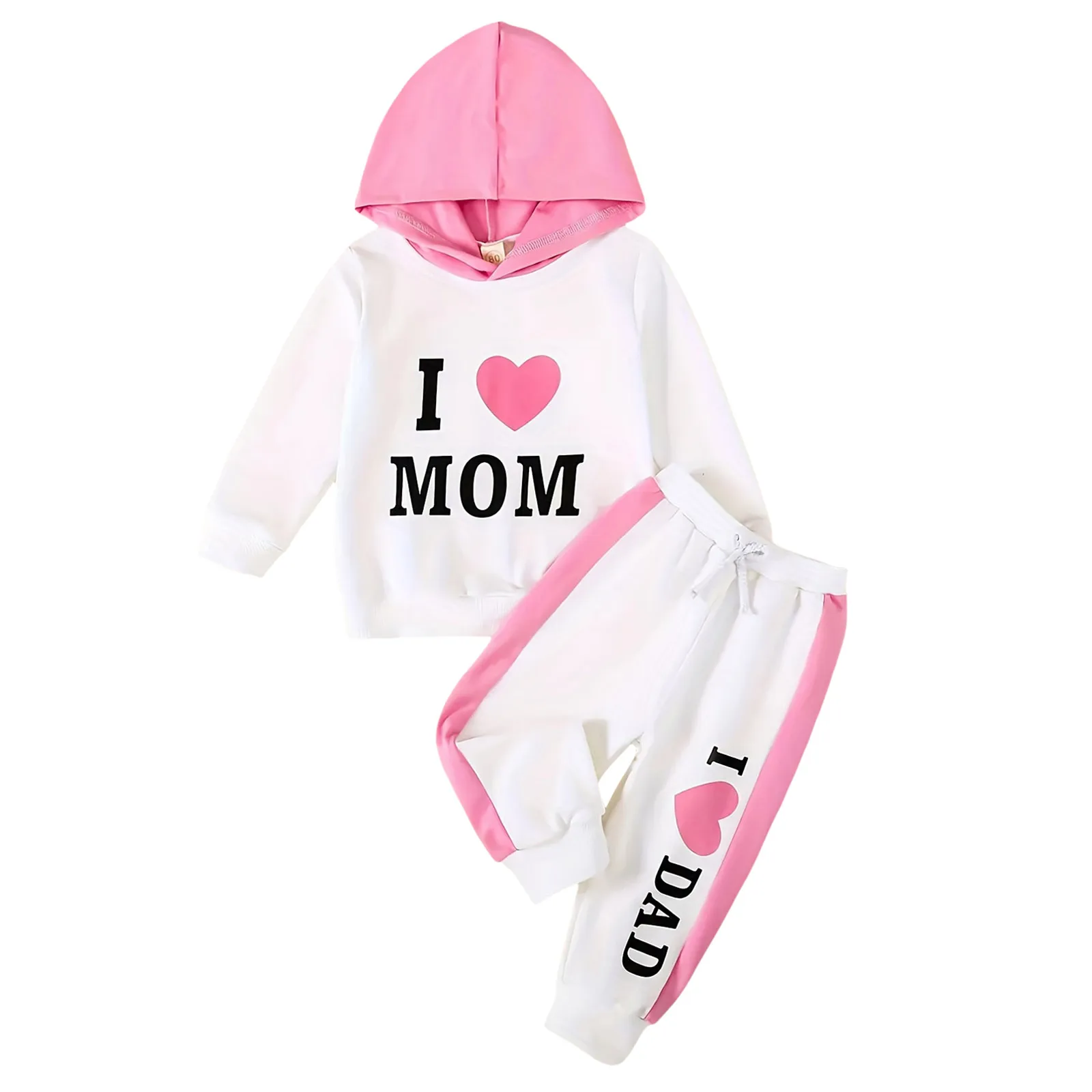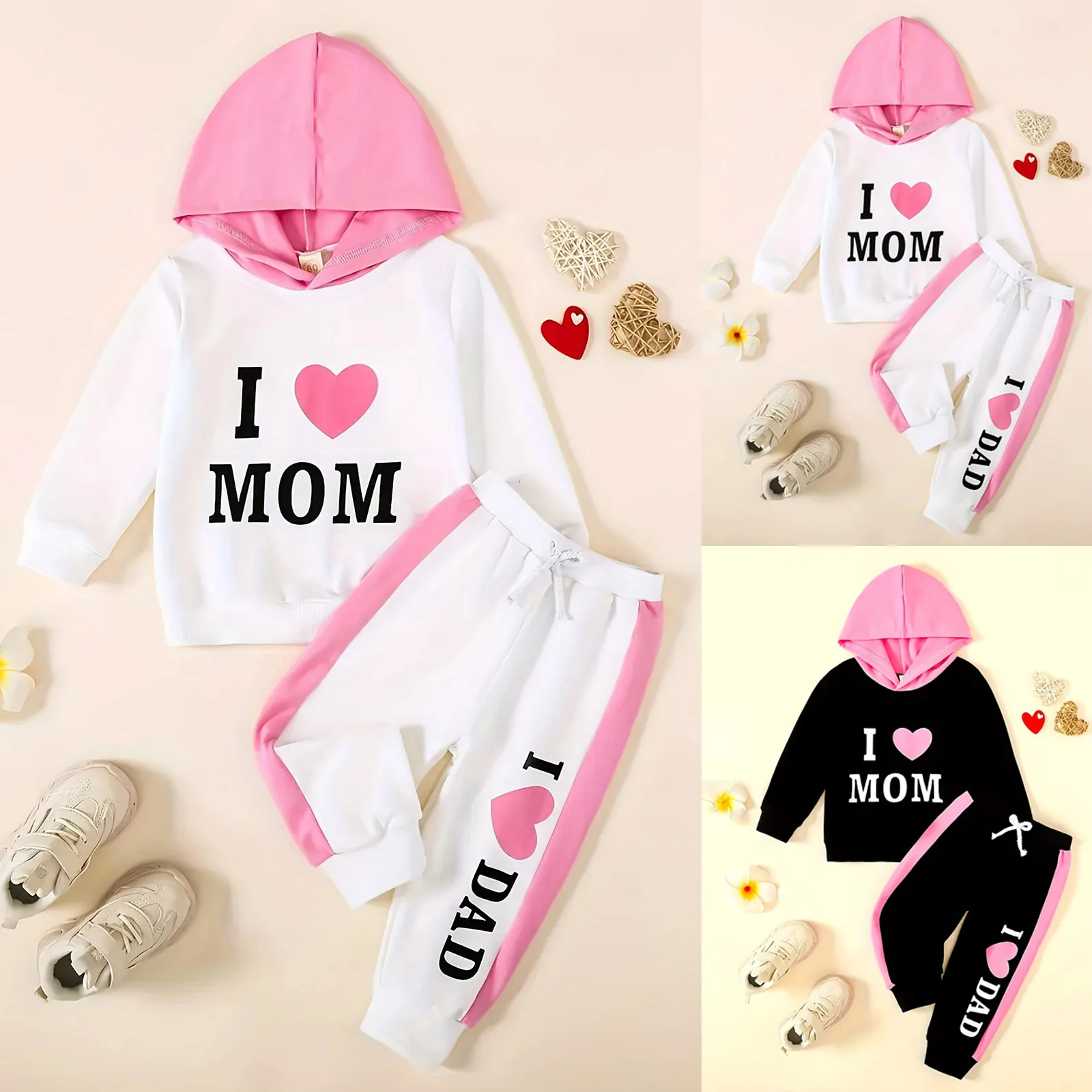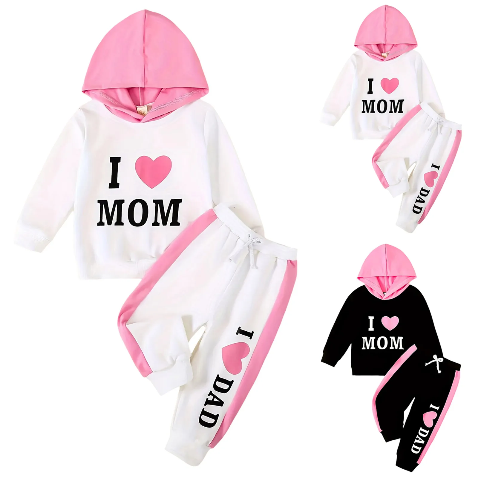 Baby Boy Spring And Fleece Hooded I Love Mom Long Sleeved Shirt Long Pants Casual Suit Trendy